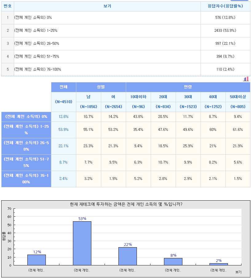 - 소득의 1-25%(53.9%) 혹은 26-50%(22.1%)를 재테크에 투자