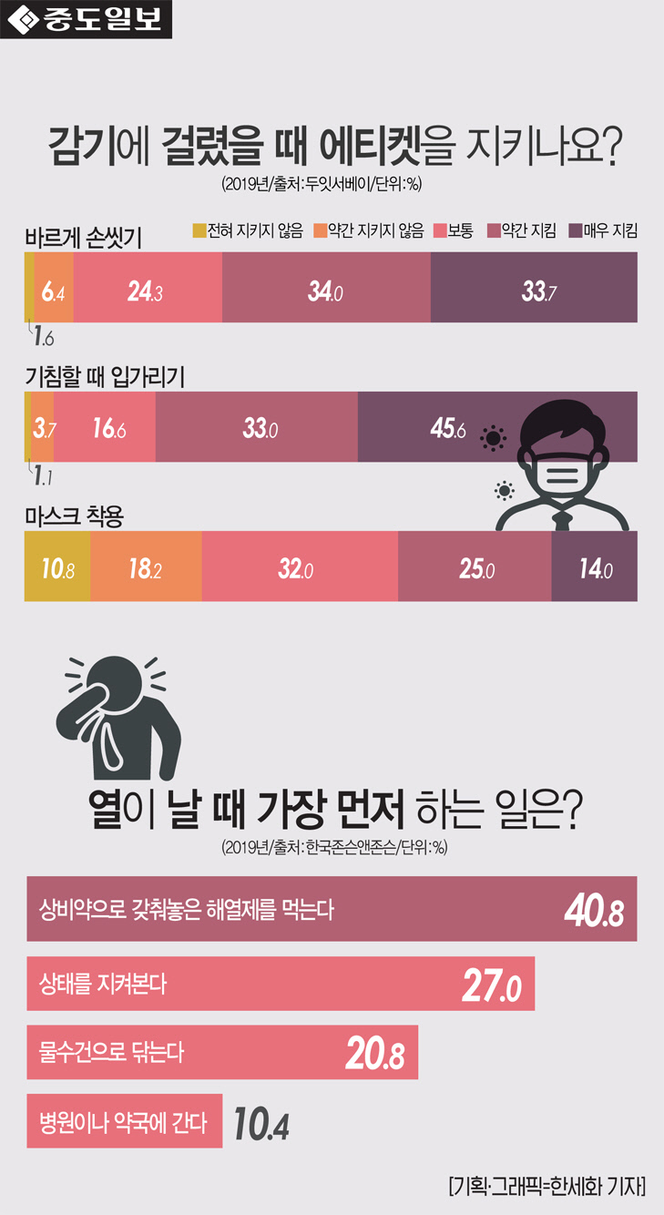 [중도일보] 감기에 걸렸을 때 '입가리고 기침하기' 45.6%'지킨다'... 열이날 때 가장 먼저 하는일은?