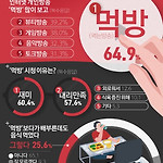 ‘먹방(음식 방송)’은 이미 방송사와 인터넷 개인 방송의 대세 프로그램 콘텐트로 자리 잡은 지 오래다. 하지만 정부는 넘쳐나는 ‘먹방’ 프로그램들이 폭식을 조장해 비만 증가 등의 부작용을 낳는다며 ‘먹방 규제’ 입장을 밝혔다. 특히 인터넷 개인 방송 등에서의 자극적 먹방 실태 조사와 함께 먹방 가이드라인을 제시하겠다고 말했다. 이에 온라인 설문 업체 두잇서베이가 ‘먹방(음식 방송) 규제’에 대해 설문 조사했다. 이 조사에서 응답자들은 인터넷 개인 방송 중 가장 인기 있는 방송 콘텐트로 ‘먹방(64.9%)’을 꼽았다. 먹방을 즐기는 이유로 ‘재미있고(60.4%)’, ‘대리만족(57.6%)’을 느낄 수 있어서 ‘먹방’을 많이 시청한다고 응답했다. 또 방송을 보다가 4명 중 1명은 식욕을 못 참고 음식을 먹었..