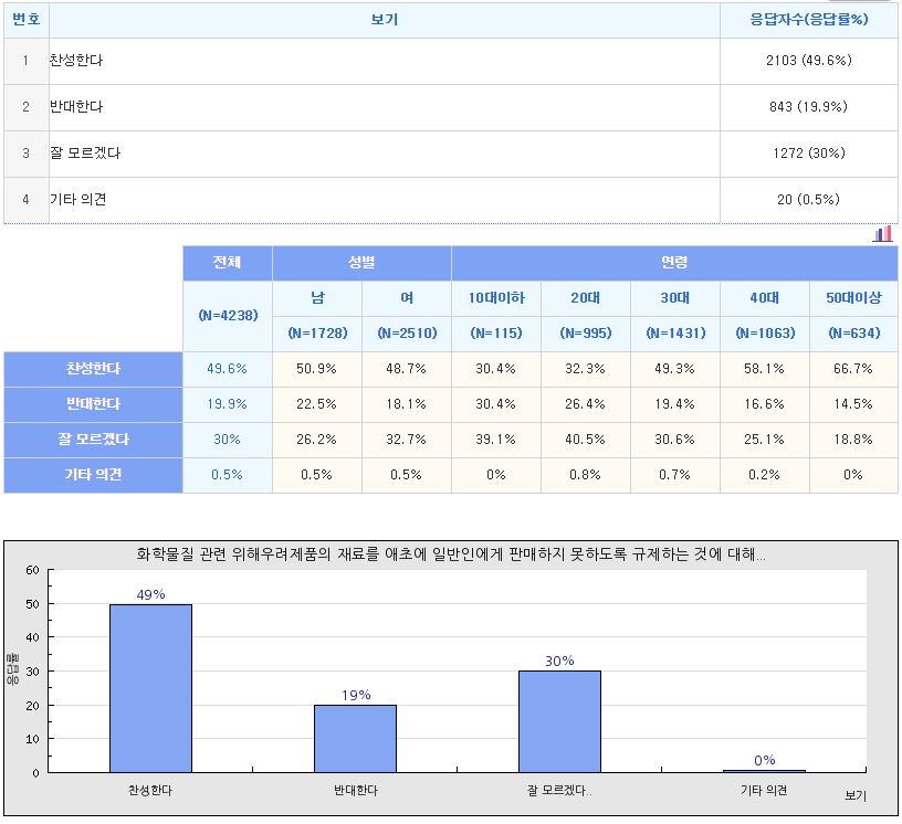 - 애초에 화학물질 관련 위해우려제품의 일반인 판매를 금지시키는 것에 대해서는? 찬성(49.6%) vs. 반대(19.9%)
