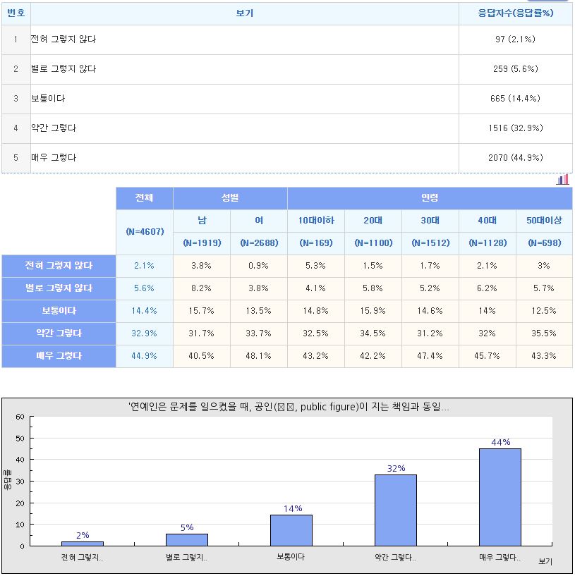 (연예인은 문제를 일으켰을 때, 공인(公人, public figure)이 지는 책임과 동일한 책임을 져야 한다'는 주장에 공감하십니까?)