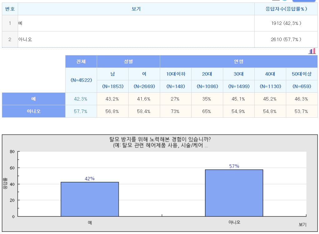 - 탈모 방지를 위해 노력해본 적이 있다: 42.3%