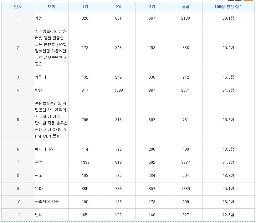 수출액은 (1) 게임, (2) 지식정보, (3) 캐릭터, (4) 방송, (5) 콘텐츠솔루션, (6) 애니메이션, (7) 음악, (8) 광고, (9) 영화, (10)독립제작 방송, (11) 만화 순으로 높았습니다.