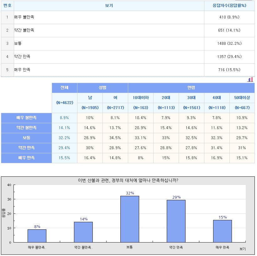 이번 산불과 관련, 정부의 대처에 얼마나 만족하십니까?)