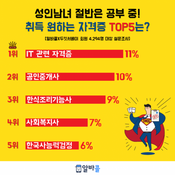 서미영 알바콜 대표는 “평균수명이 길어지고 평생직장보다 직업의 의미가 중요해지는 만큼 성인남녀의 자기계발에 대한 높은 의지가 전해진다”고 말했다.