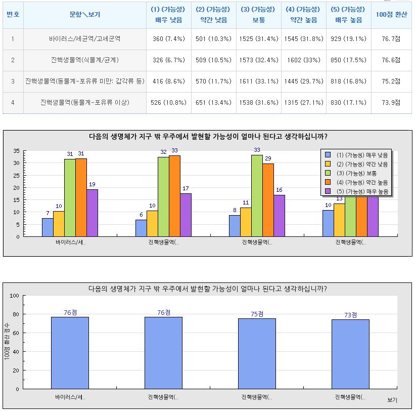 (다음의 생명체가 지구 밖 우주에서 발현할 가능성이 얼마나 된다고 생각하십니까?)