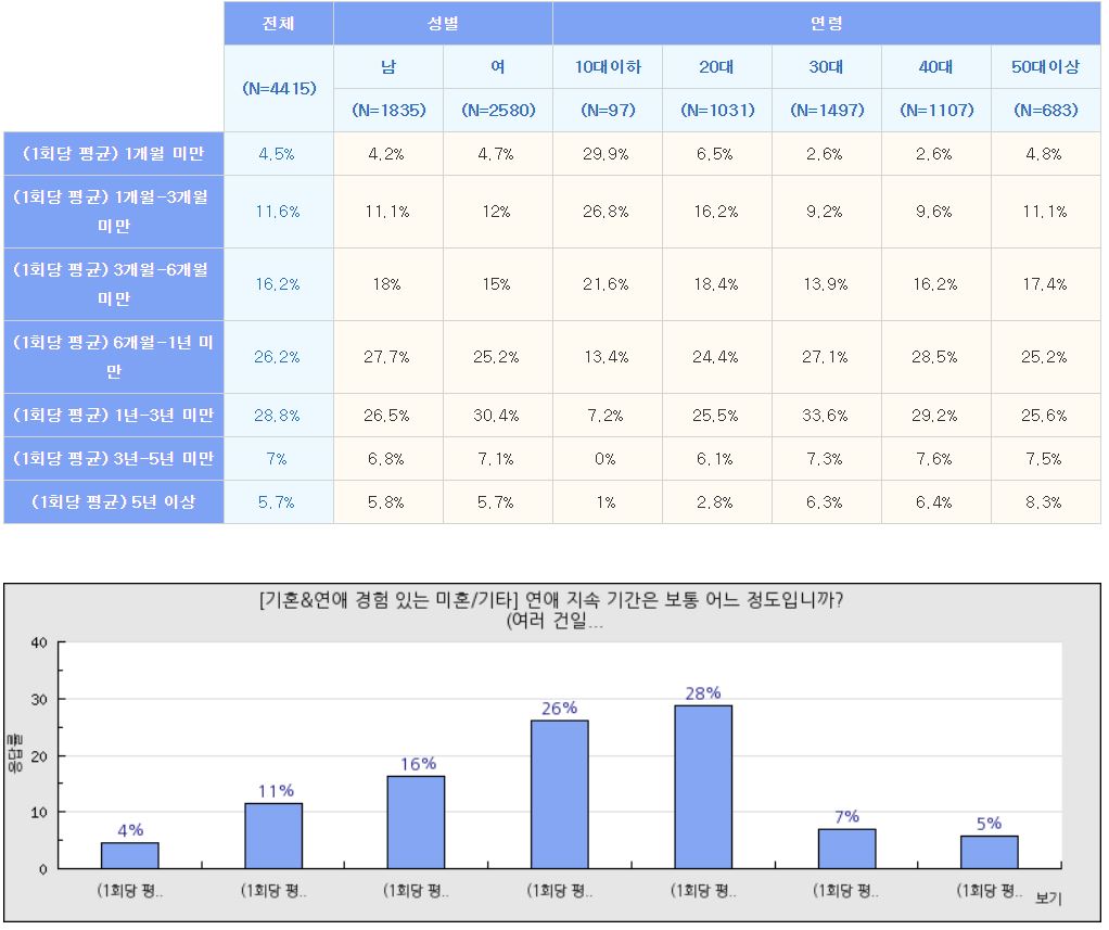 * 평균 연애 지속 기간: 1년-3년 미만(28.8%) 혹은 6개월-1년 미만(26.2%) 혹은 3개월-6개월 미만(16.2%)