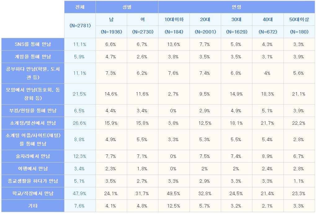 * 만난 장소: 학교/직장(47.9%) 혹은 소개팅/맞선(26.6%) 혹은 모임(동호회, 동창회 등)(21.5%)