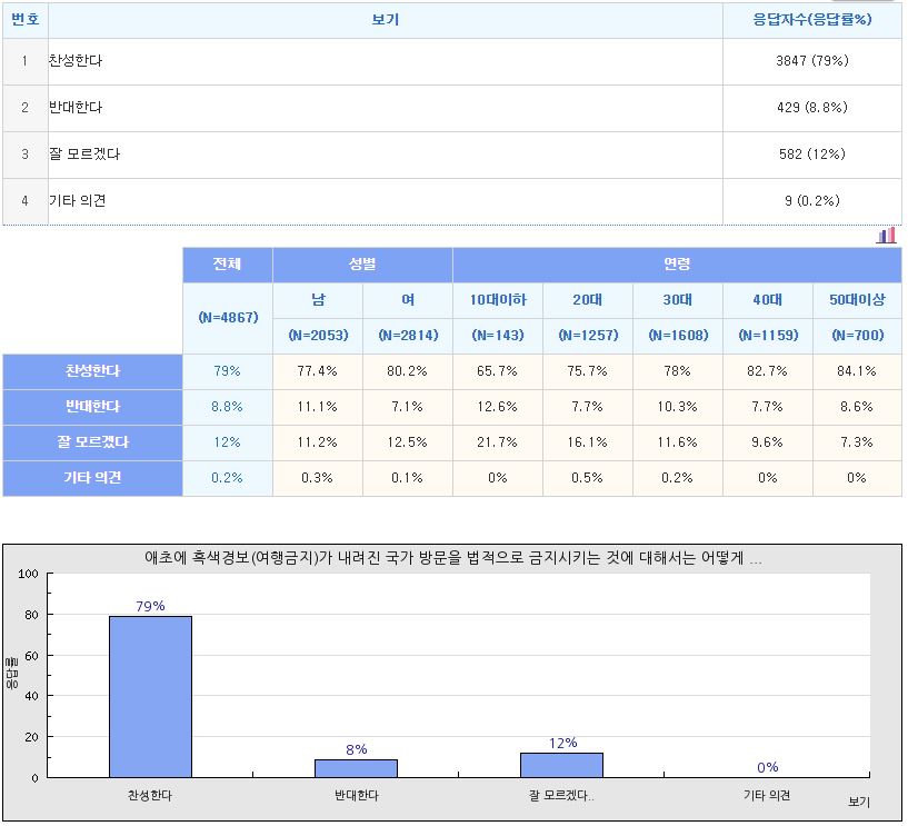 - 흑색경보가 내려진 국가로의 여행을 애초에 금지시키는 것에 대해서는 79%가 찬성