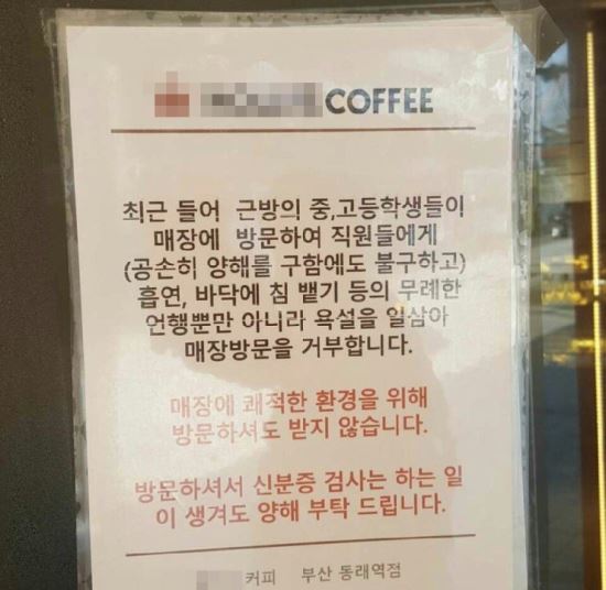 노틴에이저존을 선언한 카페는 유명 프랜차이즈의 부산점으로 '근방의 중고등학생들이 흡연, 바닥에 침 뱉기, 욕설을 일삼아 매장 방문을 거부한다'는 안내문을 문에 붙였는데요,