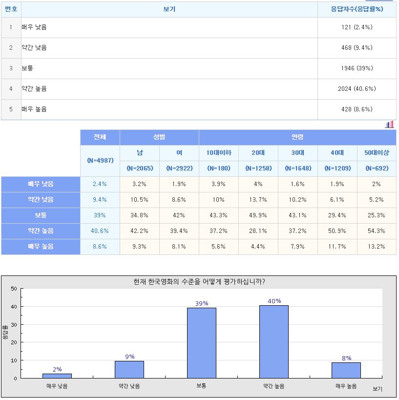 - 한국 영화의 수준은 높거나(49.%) 보통(39%)이라고 생각