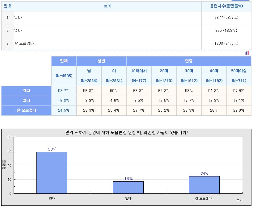 - 곤경에 처했을 때 의존할 사람이 있는 비율: 58.7% vs. 없는 비율: 16.8%