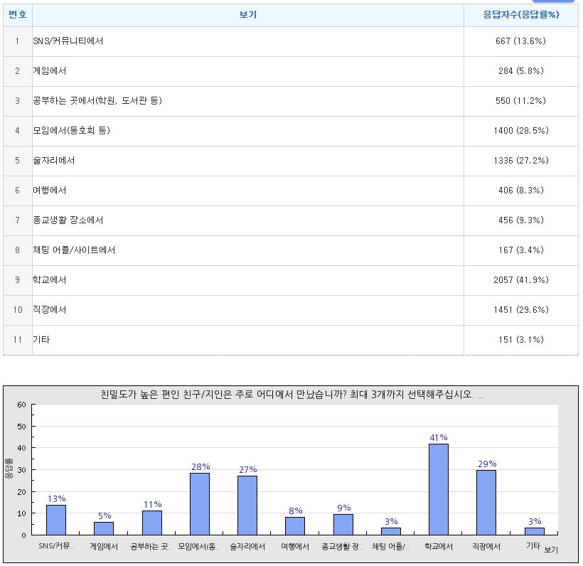 ([복수응답] 친밀도가 높은 친구/지인은 주로 어디에서 만납니까? 최대 3개까지 선택해주십시오. (복수응답 가능))