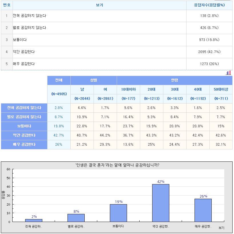 - 10명 중 6-7명, '인생은 결국 혼자'라는 말에 공감(68.7%)