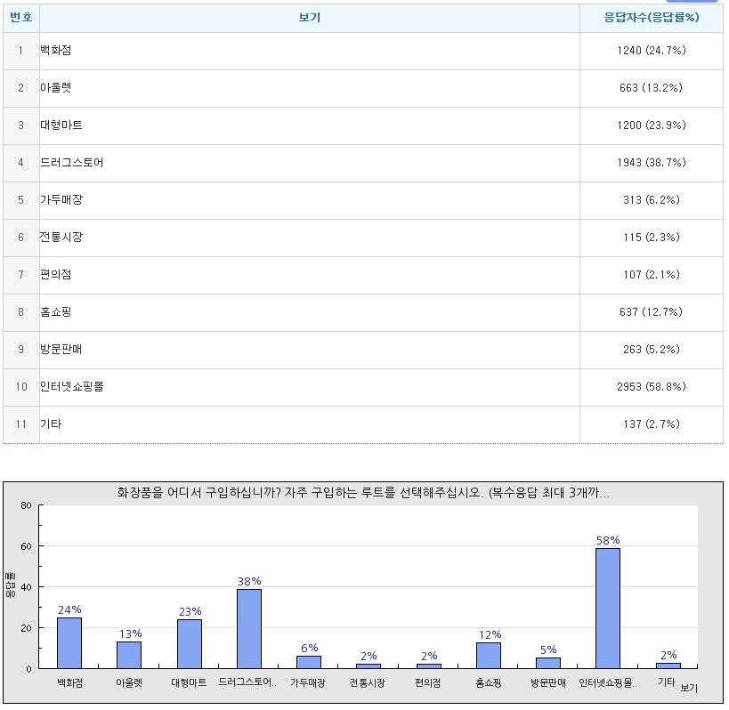 ([복수응답] 화장품을 어디서 구입하십니까? 자주 구입하는 루트를 선택해주십시오. (복수응답 최대 3개까지 선택 가능))