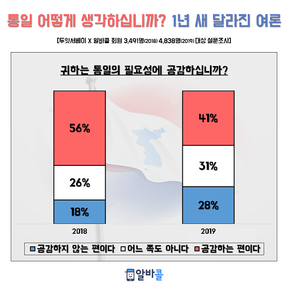 알바콜과 두잇서베이가 공동으로 조사한 '통일 어떻게 보십니까' 설문조사 결과 지난해보다 통일의 필요성에 공감하는 비율이 감소했다. ⓒ 알바콜