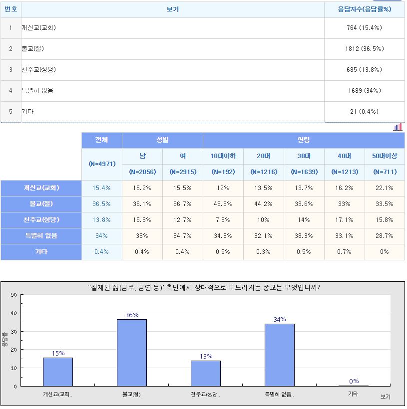 4위) 절제된 삶(금주, 금연 등)(30.3%): 두드러진 종교는 불교(36.5%) 혹은 특별히 없음(34%)