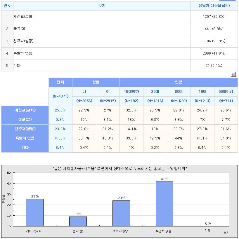('높은 사회봉사율/기부율' 측면에서 상대적으로 두드러지는 종교는 무엇입니까?)