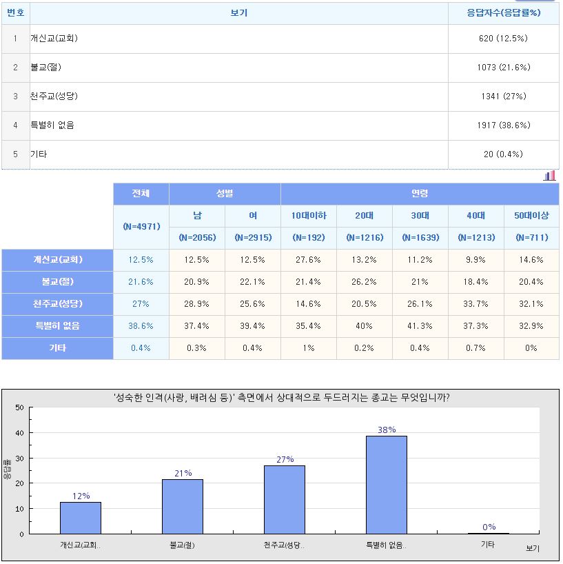 1위) 성숙한 인격(사랑, 배려심 등)(77%): 두드러진 종교는 특별히 없거나(38.6%) 천주교(성당)(27%) 혹은 불교(절)(21.6%)