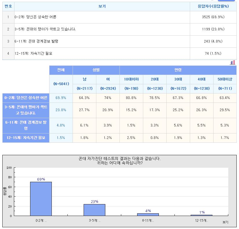 - 꼰대 자가 진단 테스트 결과, 대부분 성숙한 어른(69.9%)이거나 꼰대의 맹아가 싹트고 있거나(23.8%)