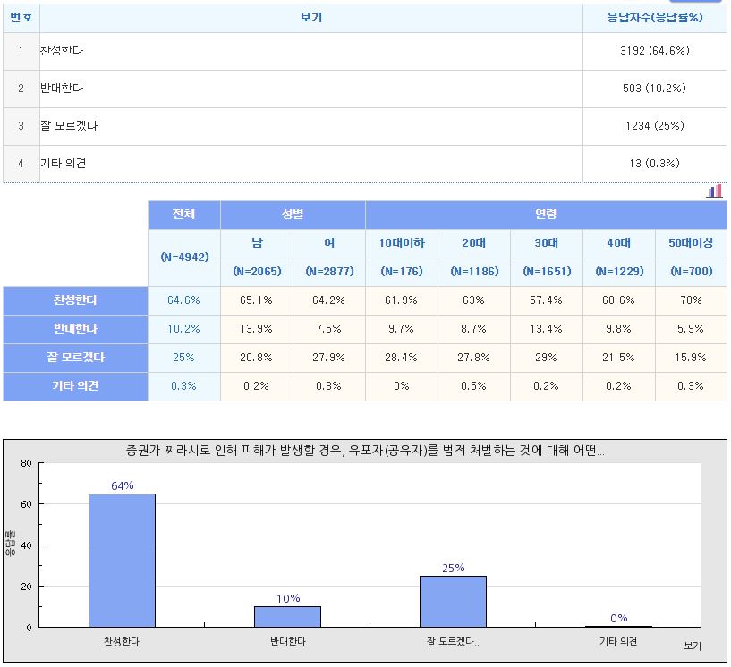 (증권가 찌라시로 인해 피해가 발생할 경우, 유포자(공유자)를 법적 처벌하는 것에 대해 어떤 입장이십니까?)
