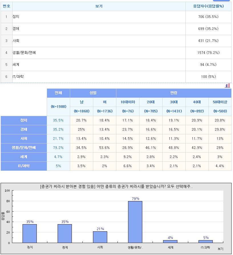 - 종류는 생활/문화/연예(79.2%), 정치(35.5%), 경제(35.2%) 등