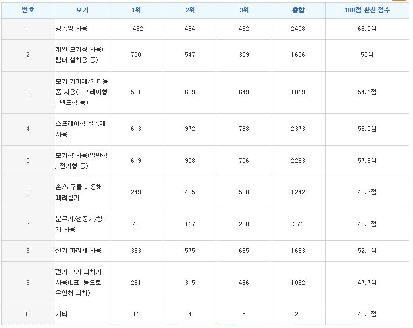 ([3순위선택] 가장 효과적이라고 생각하는 모기 퇴치법을 순서대로 3개만 선택해주십시오. (3순위선택))