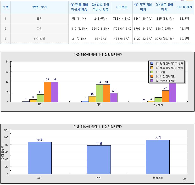 - 해충 위협도 순위: 바퀴벌레(92.9점) > 모기(86.7점) > 파리(78.1점)