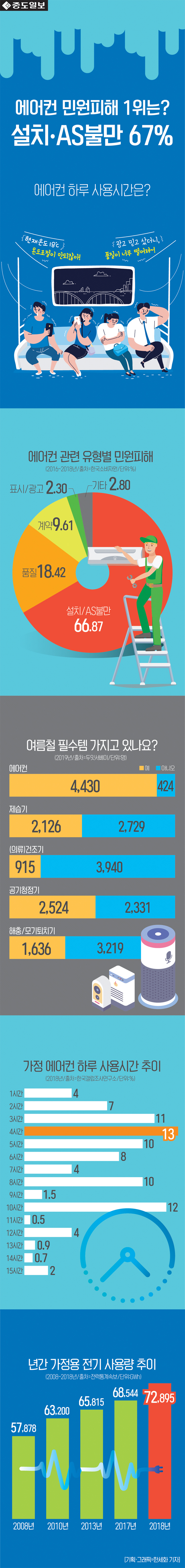 [중도일보] [인포그래픽] 에어컨 민원피해 1위는? 설치/AS불만 67%... 하루 평균 사용시간은? 본문