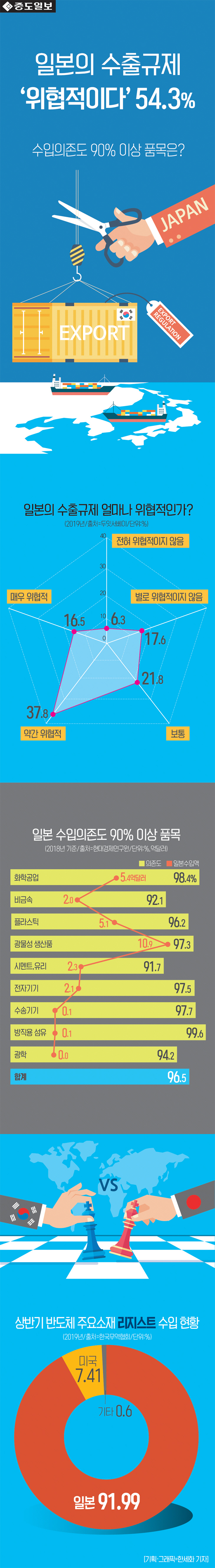 [중도일보] [인포그래픽] 일본 수출규제 '위협적' 54.3%... 반도체 핵심소재 리지스트 수입률은? 본문