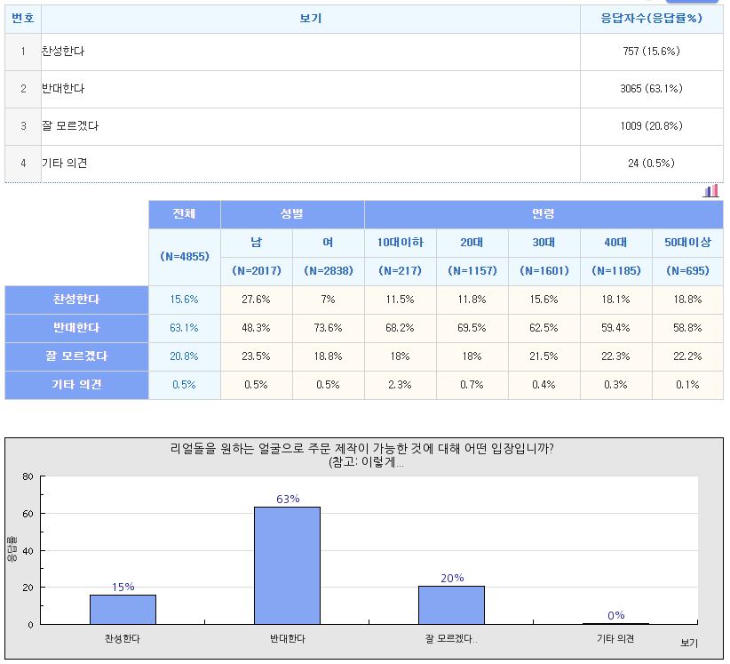 - 리얼돌을 원하는 얼굴로 주문 제작 가능한 것 역시 반대 의견(63.1%)이 찬성 의견(15.6%)보다 높아