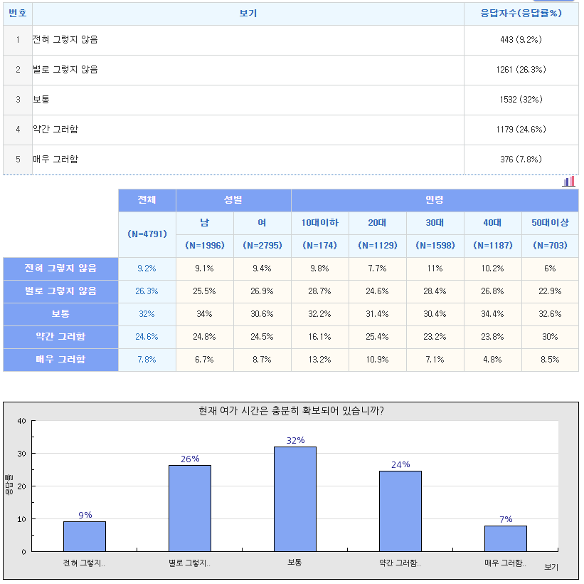- 내 여가시간, 충분하지 않다(35.%) vs. 충분하다(32.4%)