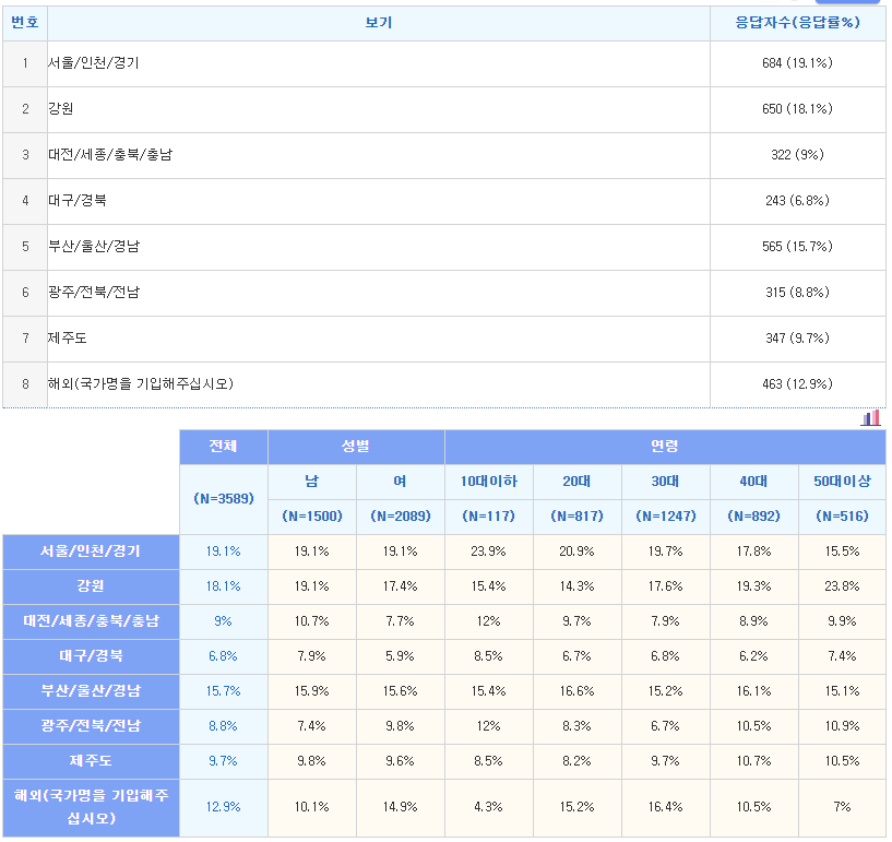 - 어디로 가나? 서울/인천/경기(19.1%) > 강원(18.1%) > 부산/울산/경남(15.7%) > 해외(12.9%)