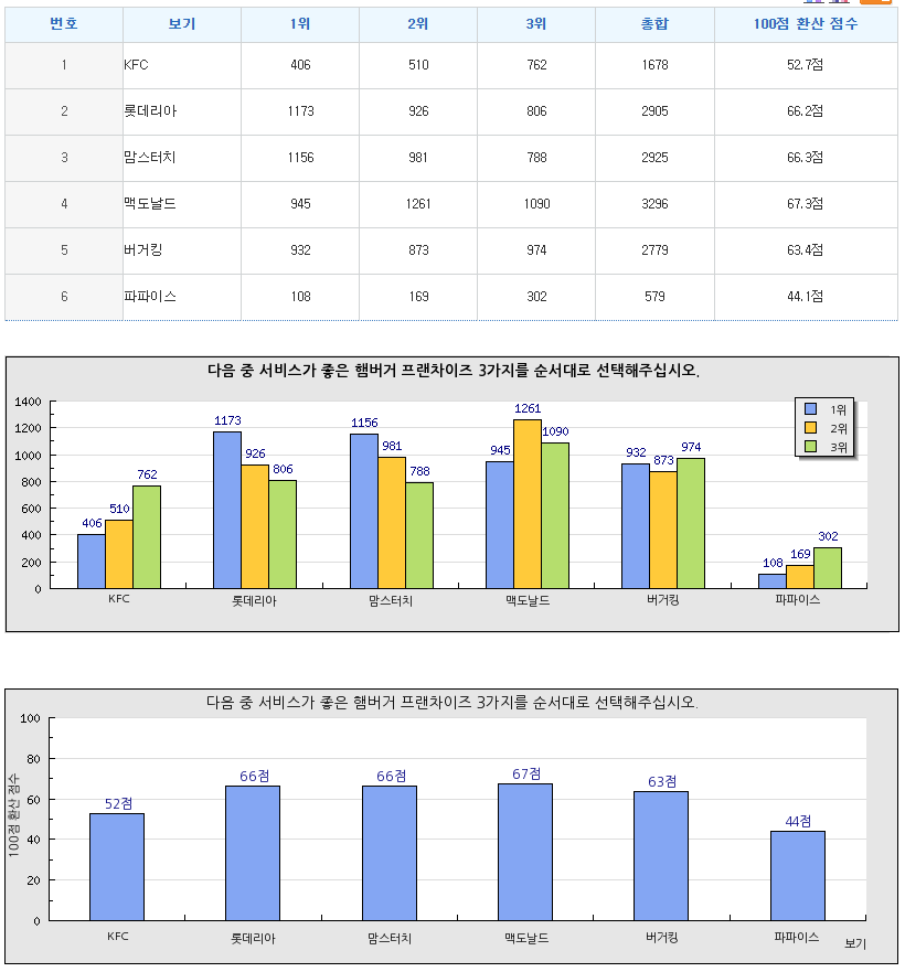 - 서비스가 좋은 곳: 맥도날드(67.3점) > 맘스터치(66.3점) > 롯데리아(66.2점)