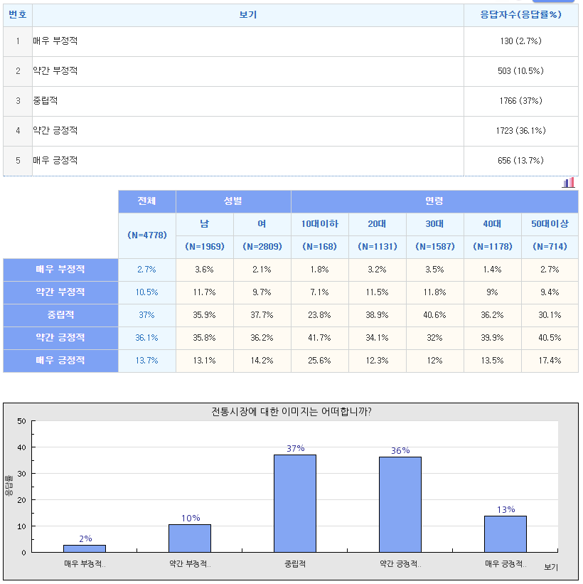- 전통시장에 대한 이미지는 긍정적이거나(49.8%) 중립적(37%)