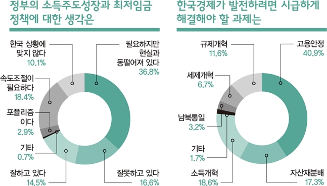 경제에 대한 국민들의 인식은 전반적으로 나빴지만 현 정부 중반에 들어선 시점에 응답자 중 상당수가 정부정책을 지지하는 모습도 볼 수 있었다. 문재인정부의 대표 경제정책이라고 볼 수 있는 소득주도성장과 최저임금 정책을 두고 가장 많은 1770명(36.8%)은 ‘필요하지만 현실과 동떨어져있다’고 답했다.