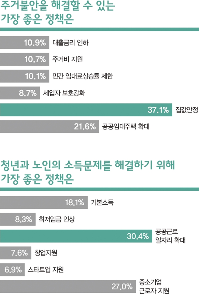 또한 부동산문제인 주거불안을 해결할 수 있는 방법으로 ▲집값안정 1789명(37.1%) ▲공공임대주택 확대 1038명(21.6%) ▲대출금리 인하 523명(10.9%) ▲주거비 지원 513명(10.7%) ▲민간 임대료인상률 제한 485명(10.1%) ▲세입자보호 강화 417명(8.7%) 등의 답변이 나왔고 기타 51명(1.1%)은 ‘규제완화, 지역 균형발전, 다주택자 과세 강화, 다자녀 무이자대출, 빈집 지원, 아파트 공급 증가, 청약기준 폐지’ 등을 제시했다.