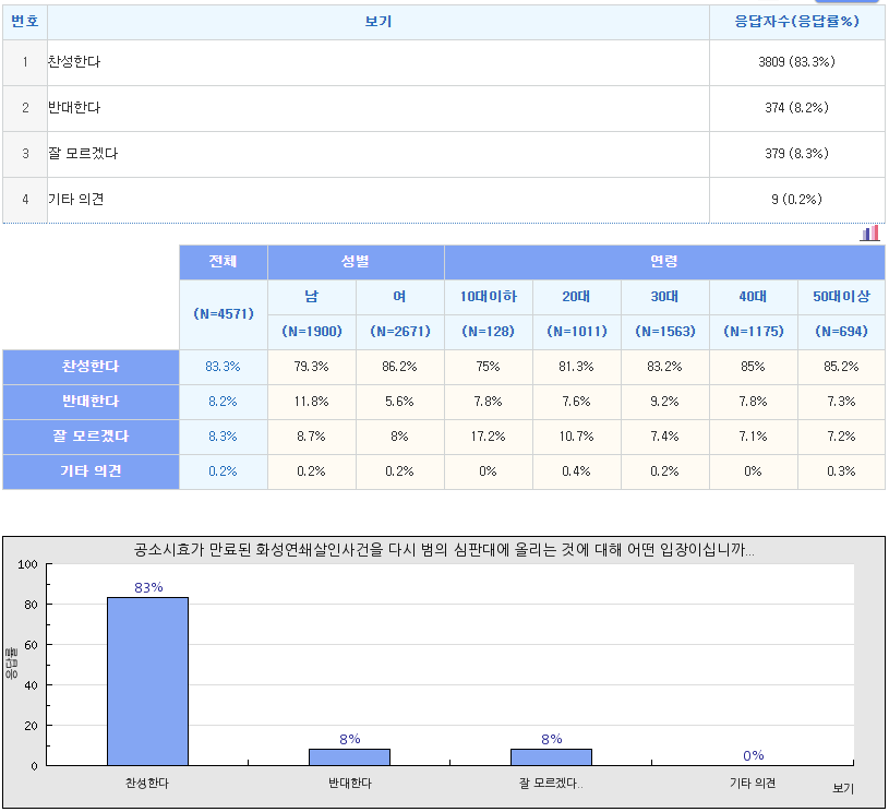 - 화성연쇄살인사건을 법의 심판대에 다시 올리는 것에 대해서는 83.3%가 찬성