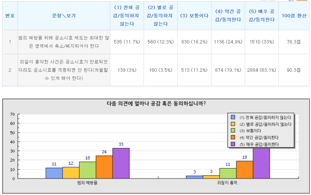 (1) 범죄 예방을 위해 공소시효 제도는 최대한 많은 영역에서 축소/폐지되어야 한다: 78.3점