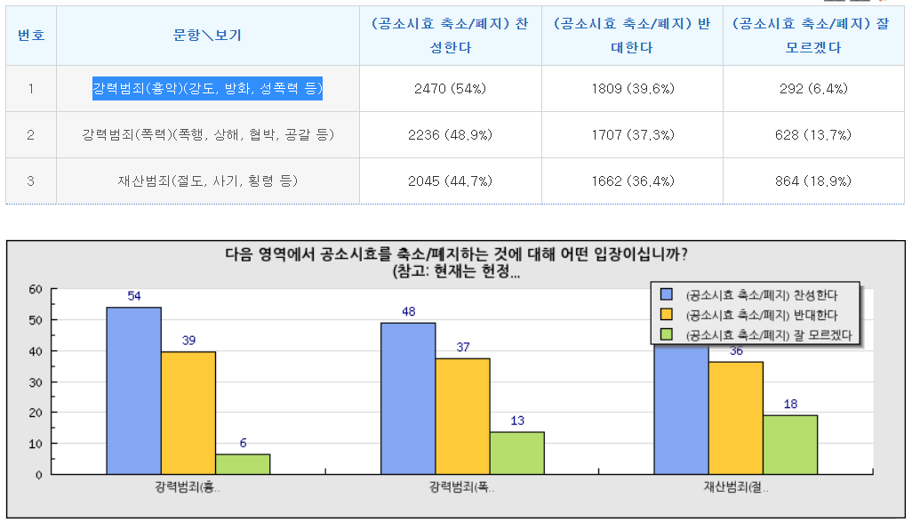 - 강력범죄(흉악) 공소시효 축소/폐지: 찬성(54%) vs. 반대(39.6%)