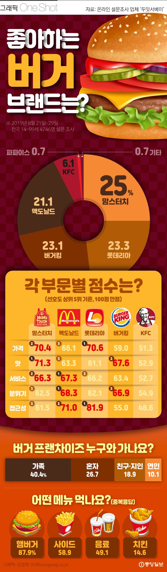 부문별(선호도 상위 5개 브랜드 기준)로 보면 가격부문에서는 롯데리아가 1위, 맘스터치가 2위를 차지했다. 맛 평가부문에서는 맘스터치가 다른 브랜드를 크게 앞서며 1위를 차지했다. 맥도날드는 서비스·매장 분위기 2개 부문에서 1위를 차지했지만, 가격과 맛에서는 비교적 낮은 평가를 받았다. 접근성에서는 롯데리아가 1위를 차지했다. 한편 버거 프랜차이즈 방문 시 동반자로는 가족(40.4%)이 가장 많았으며 이어서 혼자(26.7%), 친구·지인(18.9%), 연인(10.1%) 순이었다.