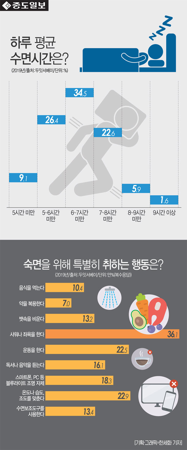 [중도일보][인포그래픽] 평균 수면, 3명 중 한명 '6~7시간 잔다' 34.5%... 숙면을 위한 행동은?
