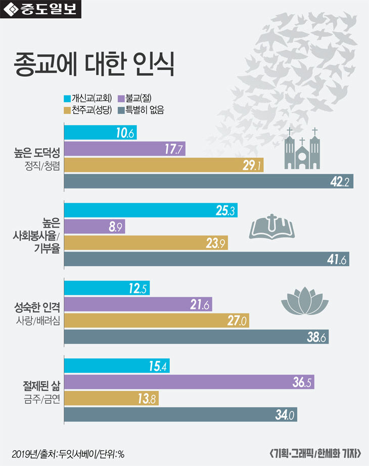 인터넷 설문조사업체 두잇서베이가 지난해 '종교에 대한 인식'을 조사한 결과, 개신교의 '높은 도덕성'이 10명 중 한 명꼴인 10.6%로 나타났다.