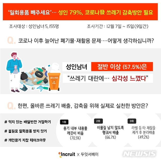 성인남녀 5명 중 4명(79.6%)은 최근 폐기물 문제에 대해 '국가적 정책강화 및 개인 노력 시급하다'고 입을 모았다.