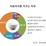 [ MBC Economy 보도자료 ] 우리나라 국민 10명 가운데 2명 가량이 아침식사를 하지 않는 것으로 나타났다. 온라인 설문조사 기업 두잇서베이가 지난달 21일부터 7일간 인터넷이용자 3400명을 대상으로 아침식사에 대해 조사한 결과 ‘아침식사를 전혀 안 한다’는 응답자는 전체의 17.9%로 나타났으며, ‘매일 챙겨 먹는다’는 응답자는 39.9%에 그쳤다. ‘아침식사가 하루 일과와 학업에 도움이 되느냐’는 질문에는 응답자의 71%가 ‘도움이 된다’고 대답했으며, 주로 먹는 식사 종류로는 ‘밥 류’(74.5%), ‘빵 종류’(8.9%)순으로 나타났다. 한편, 아침 식사를 하지 않는 이유로는 ‘좀 더 자고 싶어서’(38.1%), ‘안 먹는 습관’(29.1%)을 들었으며, 아침 식사를 하지 않는다는 응답..