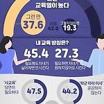자녀 교육 당신의 생각은?대한민국 상위층의 대학 입시를 소재로 한 JTBC 드라마 ‘SKY 캐슬’이 비지상파 시청률 신기록을 세운 가운데 온라인 여론조사 업체 두잇서베이가 전국 14~99세 남녀 4154명을 대상으로 ‘자녀 교육과 대한민국의 교육정책’에 대한 설문 조사를 실시했다. 이 조사에서 응답자 10명 중 4명꼴인 37.6%가 자신은 ‘교육열이 높은 편’이라고 응답했다. 반면 자신은 교육열이 높지 않다고 응답한 응답자는 19.3%였으며, 43%의 응답자가 보통 정도의 교육열이라고 응답했다. 자녀 교육 방침에 대한 질문에는 절반가량인 45.4%의 응답자가 ‘필요해도 자녀가 원치 않으면 시키지 않는다’고 답하며 ‘자녀가 원치 않아도 교육을 시키겠다(20.8%)’고 답한 응답자의 의견을 앞서는 것으로 나..