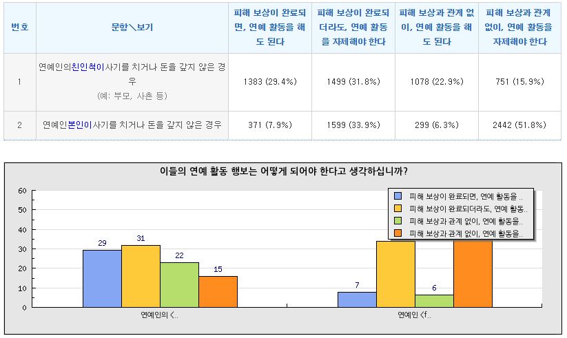 * 연예인 친인척이 사기를 쳤을 경우: 연예 활동을 자제해야 한다는 의견(47.7%)과 해도 된다는 의견이 엇비슷(52.3%)