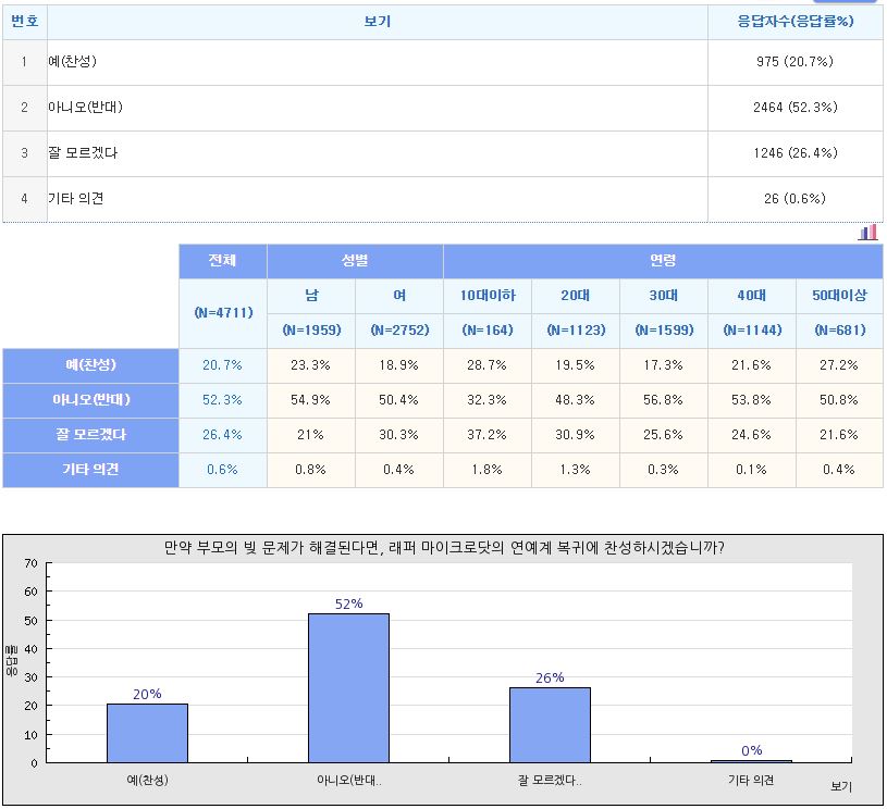 - 마이크로닷의 연예계 복귀에 대해서는 52.3%가 반대(찬성 비율: 20.7%)